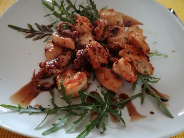 Včeraj moja dva pizzo, jaz pa gambere in lignje, solato.