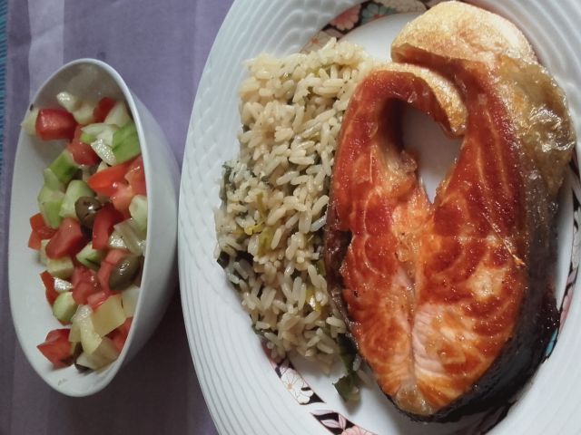Riž na poru, losos, grška solata