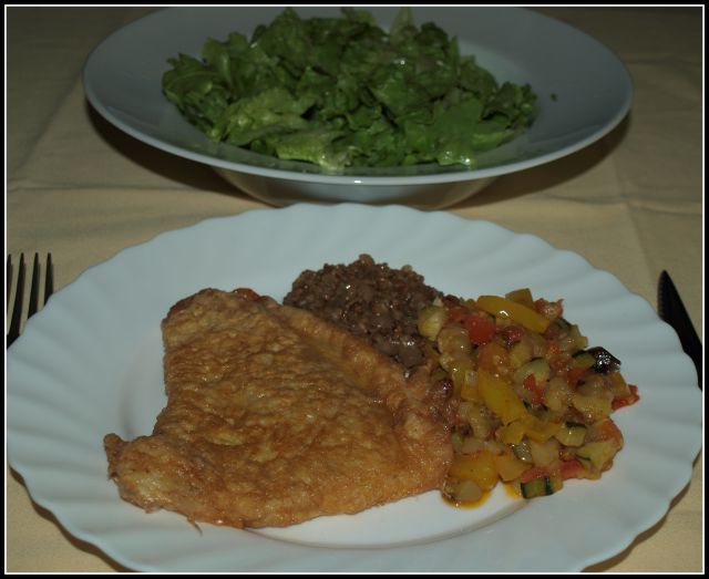 Puranje po pariško, ajdova kaša s suhimi jurčki, zelenjavni mix v voku, zelena solata