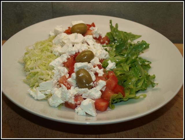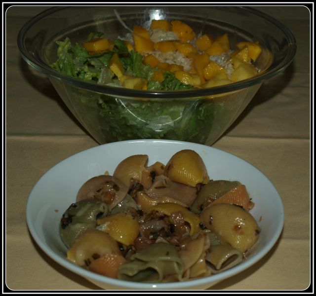 Makarončki na olivnem, česnu, peteršilju, vinu in parmezanu; zelena solata z zeljem in mangom