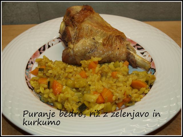 Pečeno puranje bedro, riž s korenčkom, bučko, porom in kurkumo pečeno v pečici; mešana solata