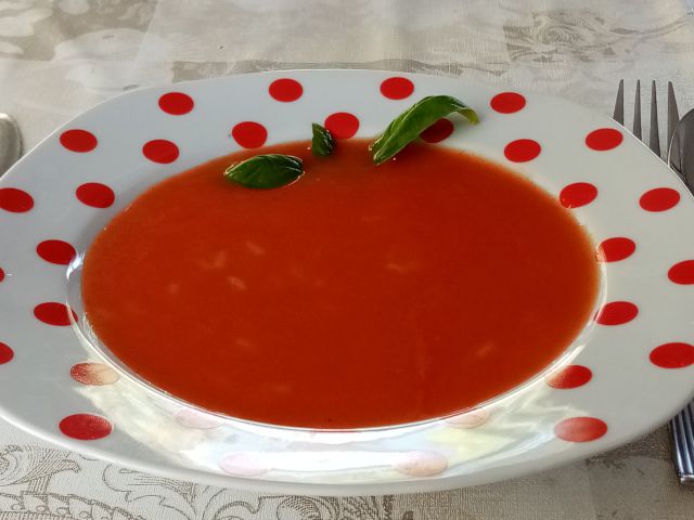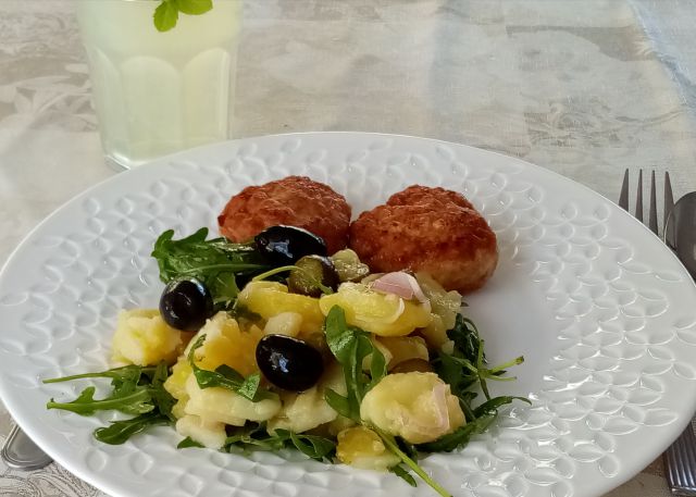 Paradižnikova juha z rižem, polpeti, krompir solata na rukoli: