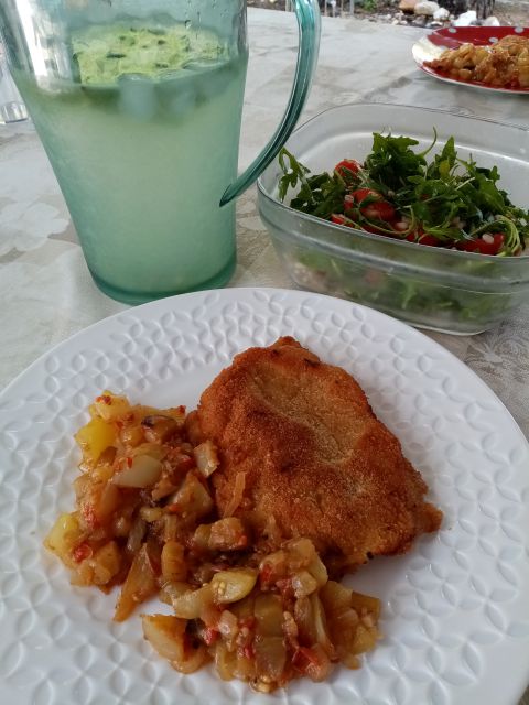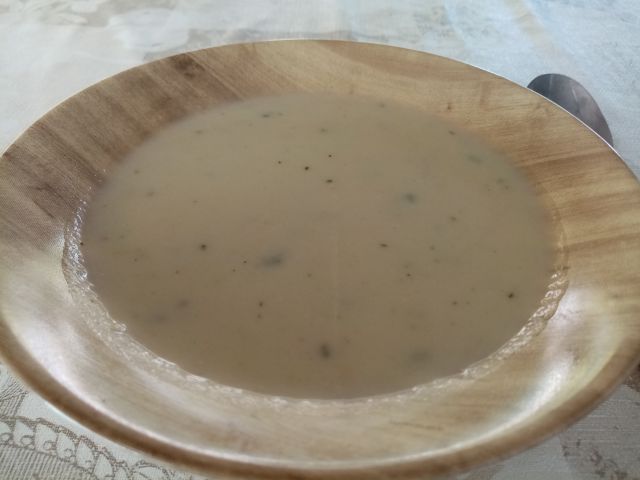 Česnova juha, file osliča po tržaško, krompirjeva solata s kumaricami.