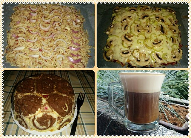 Včeraj sem nama naredila pizzo, ki je imela namesto testa krompirjevo dno, vam povem, fino je. Ker sem uporabila surov krompir (naribanemu sem dodala jajce), sem najprej spekla dno, potem pa nadevala in še deset minut peke. Za današnji težko pričakovani piknik sem pa naredila šarloto, ki pa se mi je malo ponesrečila, saj je topla krema stopila nadev v roladi. Vsaka šola nekaj stane, a ne. No, upam pa, da bo dobra. Trenutno čaka na popoldan v skrinji, ker se bojim, da želatina ni dobro "prijela". Ker sem pa že ravno stepala smetano za sladico, jo je nekaj šlo še na kavico