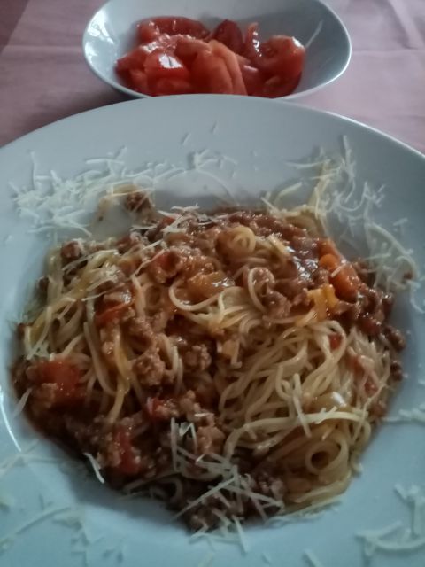 Očitno mu je tako priljubljena jed, da se je ne naveliča, no, naj to jé, jaz bom pa na ocvirkih pečena jajčka, za oba bo pa solata iz kumaric, paradižnika in čebule. Nebi pa bilo slabo, če bi dodala še mozzarello in žličko kisle smetane. Uganite, kdo jo bo pripravil ...