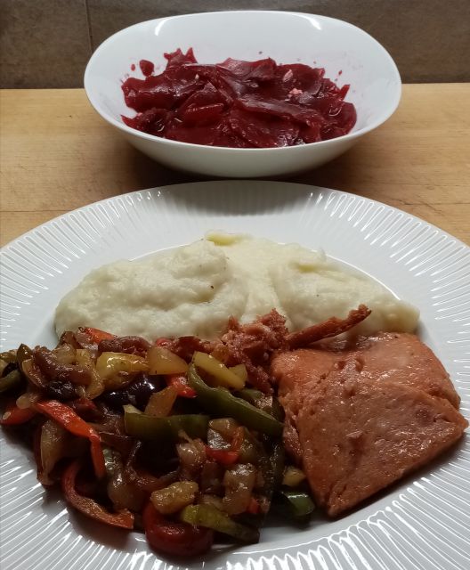 Pire krompir/bučka; čebula, paprika, bučka; popečen mesni doruček; rdeča pesa