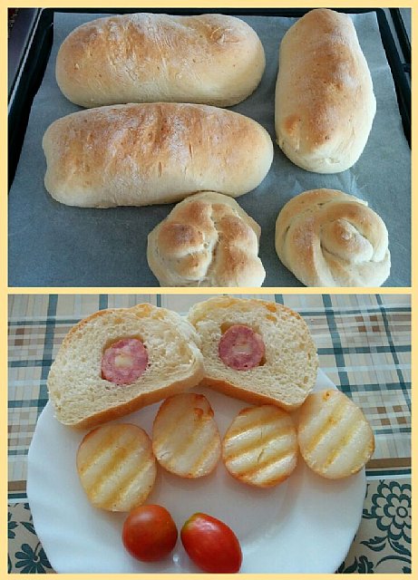 Včeraj sem naredila krompirjevo testo za kruh, vanj ovila klobase s sirom in spekla. Poleg kuhan krompir, popečen na toast pekaču ter paradižnikova solata s kumarami ![]()