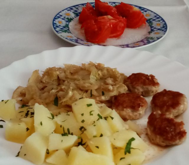 Dušeno zelje, krompir v kosih, piščančji krogci, paradižnik