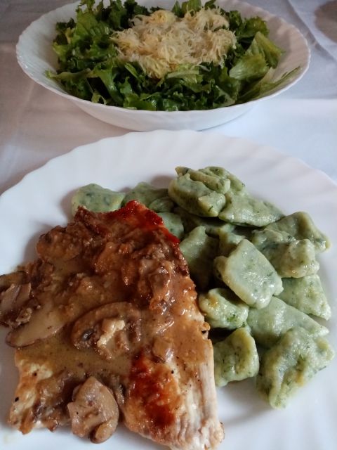 Zeleni njoki, puranji v šampinjonovi omaki, zelena solata z zeljem