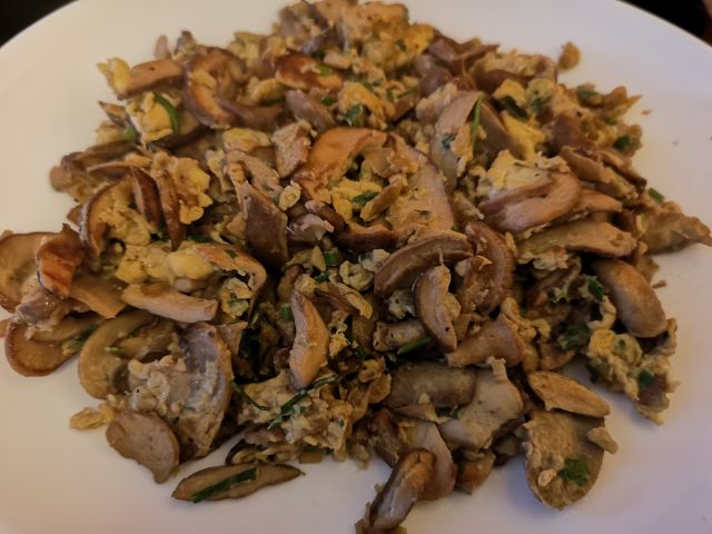 Včeraj sva jedla popečena piščančja prsa, narezana na koščke, pražene šampinjone in paradižnikovo solato