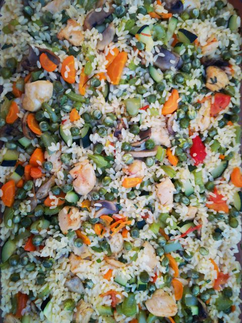 Danes je bil za kosilo pečen riž v pečici z piščancem in zelenjavo.