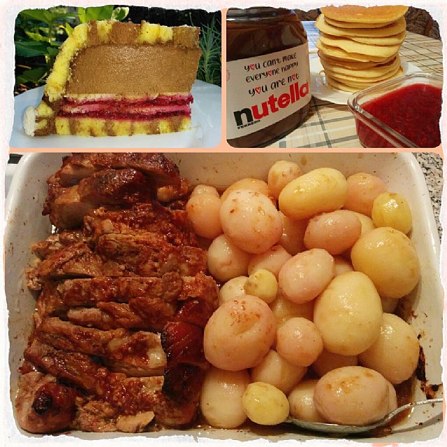 Svinjska pečenka, kuhan krompir, kasneje dodan v pekač k mesu, praženi šampinjoni, čez vse to je bila plast kruhovega testa, ki se je zapekla potem v kruhov pokrov, kar pa nisem uspela slikati. Solata je bila kombinacija zelje in paradižnik. Sladica pa čokoladna šarlota z malinami.