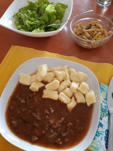 Danes ostanek ostanek omake govejih trakcev, za sina in zame piščančja omaka, reciklaža pire krompirja z dodatkom skute v njoke, zelena solata, stročji fižol