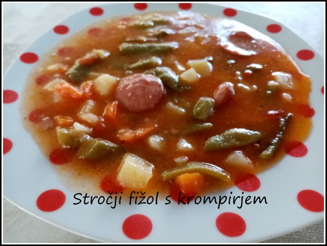 stročji fižol in krompir v koščkih, zabeljena z ocvirki