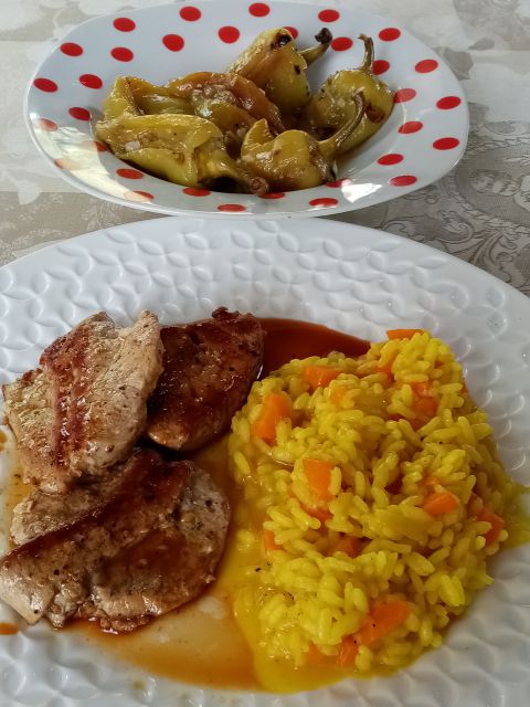 Rižota s korenčkom, sv. file; paprika v česnu; skutno/blitvina pita