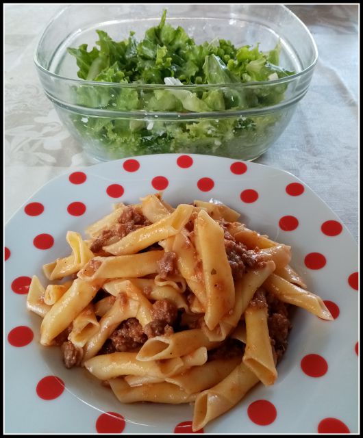 Fuži z omako bologneze, zelena solata