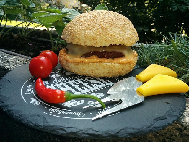 Zjutraj sem spekla bombetke s sezamom v testu in pred peko še povaljane v sezamu, ki sem ga predhodno popražila, kar je bila dobra odločitev. Spekla še pleskavice, narezala paradižnik in kosilo je bilo nared. Hamburger. Tako dober, da bi na meniju lahko bil pogosteje.