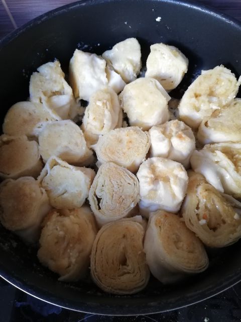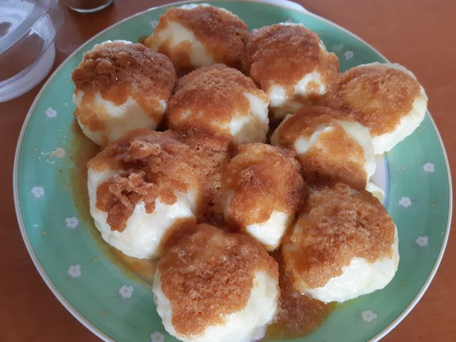 Skutni štruklji, ''rdeči kompot (domače češnje iz zmrzovalnika, slive, jabolka)