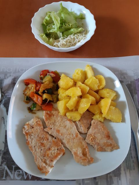Danes naravno pečeni zrezki, dušena zelenjava, popečen krompir, mešana solata( vse iz vrta).