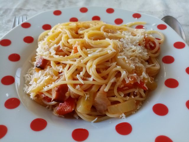 Bo pa zdajle pozno kosilo: špageti z mesno -. korenčkovo omako, rezine kumarice, rahlo posoljene.