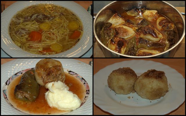 Nedelja: goveja juha z domačimi rezanci, pečen piščanec, pečen krompir, mešana solata iz paradižnika, paprike, kumare in čebule. Potica z nadevom iz jabolk, fig in banan ter kava.