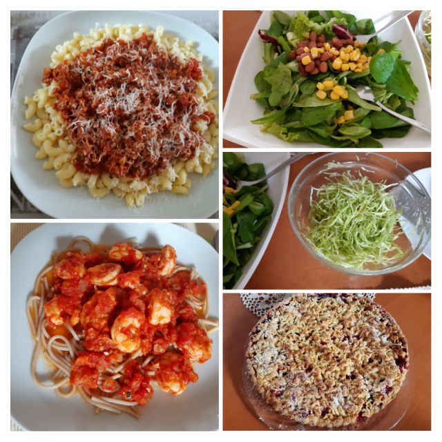 Danes za fanta bolognese omaka, polžki, zame gamberi s paradižnikovo omako, solata, slivova pita