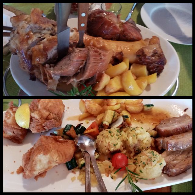 Včeraj goveja in porova juha, telečja in svinjska pečenka, sirovi štruklji, krompir po mlinarjevo, gobova omaka, mešana solata. Danes "ostanki" včerjšnjega kosila, jutri segedin.
