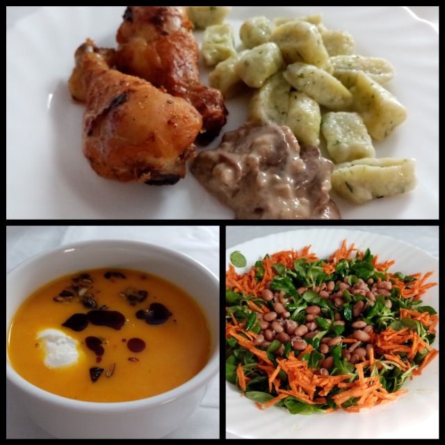 Bučna juhica; njoki, piščančje nogice, omaka s šampinjoni; motovilec s korenčkom in fižolom