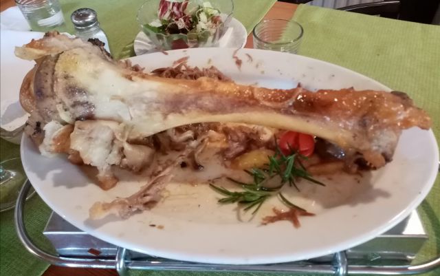 telečja krača s pečenim krompirjem in zelenjavo;