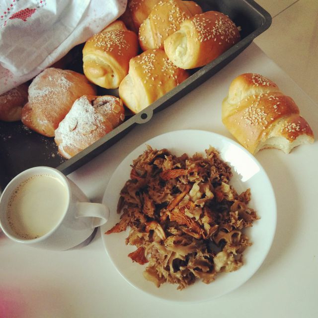 A tudi zajtrk ni zaostajal, ker je mami že zjutraj na vrata dostavila še tople rogljičke, no, še gobice sem prepražila in kavico naredila