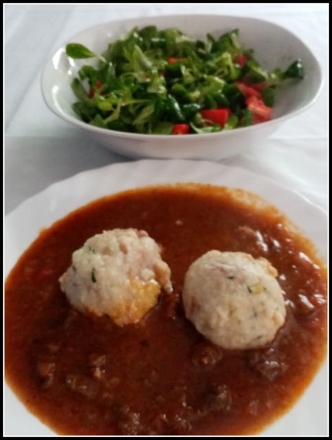 Goveji golaž, kruhovi cmoki, motovilec s papriko: