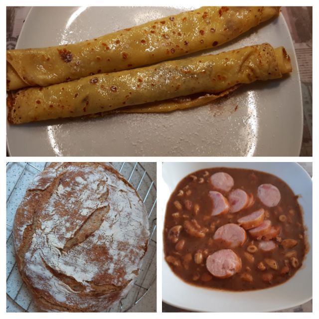 Danes fižolova pašta, kranjska klobasa, kruh, palačinke