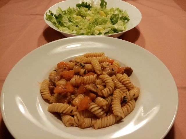 Makaronovo meso, zeljnata solata in endivija s krompirjem; skutno-višnjev zavitek na maslenem testu:
