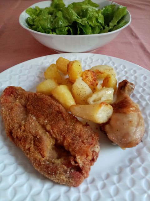 Panirana rdeča paprika polnjena s sirom, pečen krompir in pišč. nogica; zelena solata