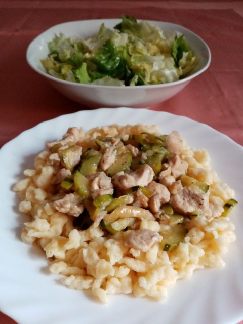 Špecli, piščančje meso z bučko, endivija s krompirjem