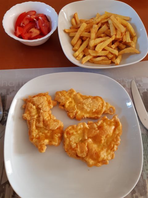 Danes brzinsko kosilo - pariški zrezki ( za naju z možem naravno pečeni), pomfri, paradižnikova solata iz paradižnika sorte Lušt