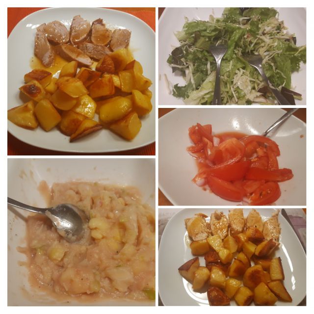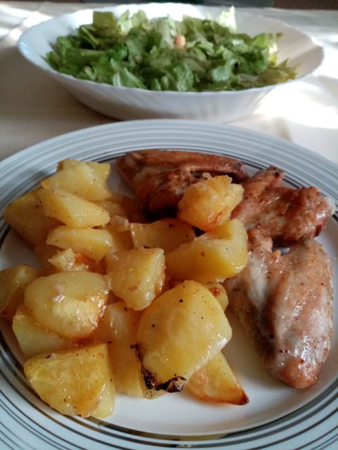 juhica, pražen krompir, pečen beli mesek, zelena solata
