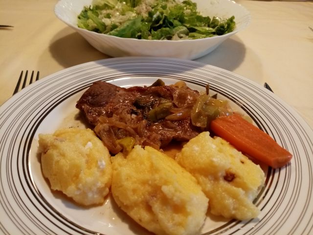 Vratovina v čebulni omaki, zapečena polenta, kristalka in zeljnata solata