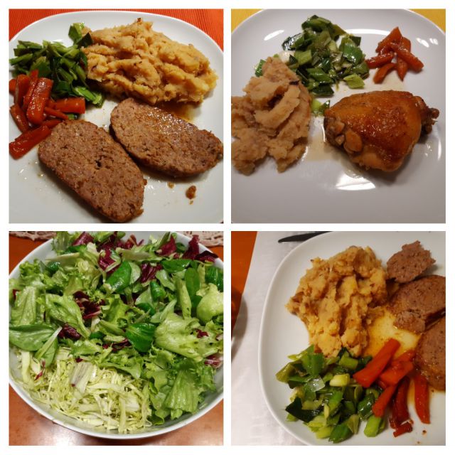 Mesna pečenka, kos piščanca, pečeno korenje, pražen krompir, dušen por, mešana solata