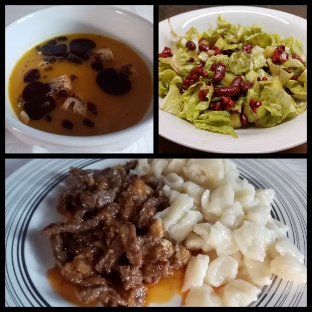 Bučna juhica s popečenim kruhom, bučnimi semeni in oljem; goveji trakci v voku, ščipanci; solata: štrucar, fižol, krompir in granatno jabolko.