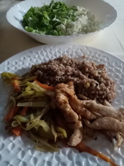 Ajdova kaša na poru in slanini, piščančji trakci politi z vinom, zelenjava v voku; zeljnata in zelena solata