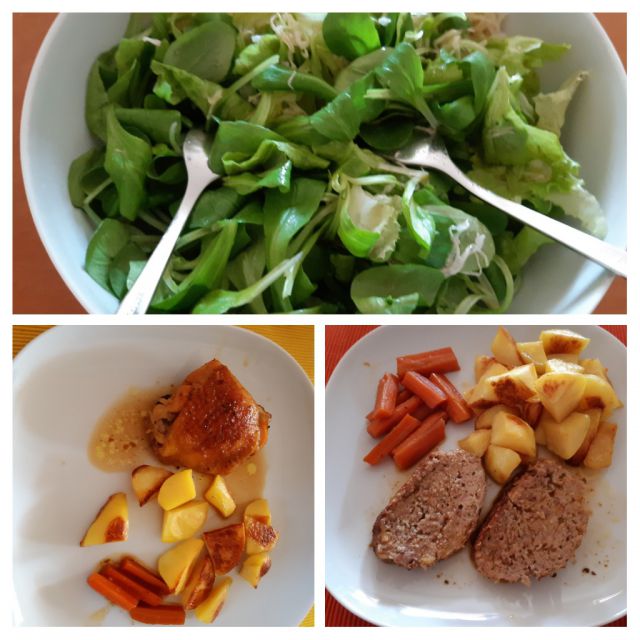 Danes mesna štruca, pečeno korenje, kos piščanca, mešana solata