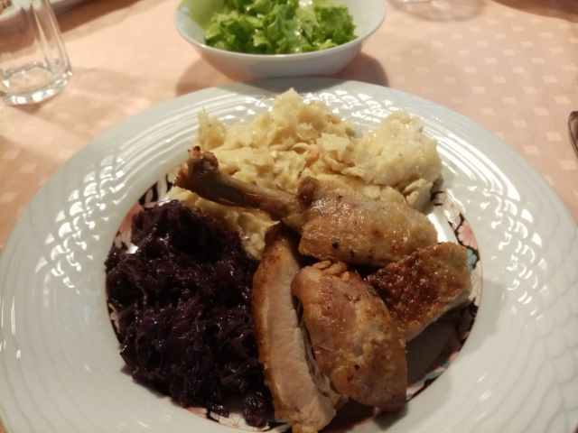 Ajmohtc na kislo, mlinci, rdeče zelje, pečena račka, piščanec in sv. rebra; zelena solata; jabolčni zavitek; vino, sok, coca-cola, kavica