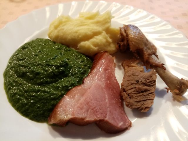 Goveja juhica z ribano kašo, pire krompir, špinača, kuhana krača, gov. iz juhe, račka in piščanec (od včeraj); rafaelo kocke
