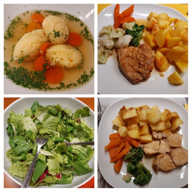Nedelja: goveja juha, pite krompir, pariško pečeni svinjski zrezki ter zeljna solata. Sladica kostanjeva rolada.