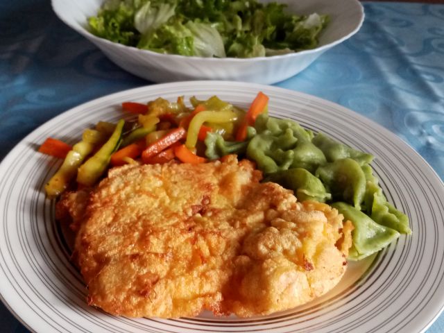 Bučna, juhica; piščančji zrezki po pariško, zelenjavni mix iz voka, žlikrofi; zelena solata