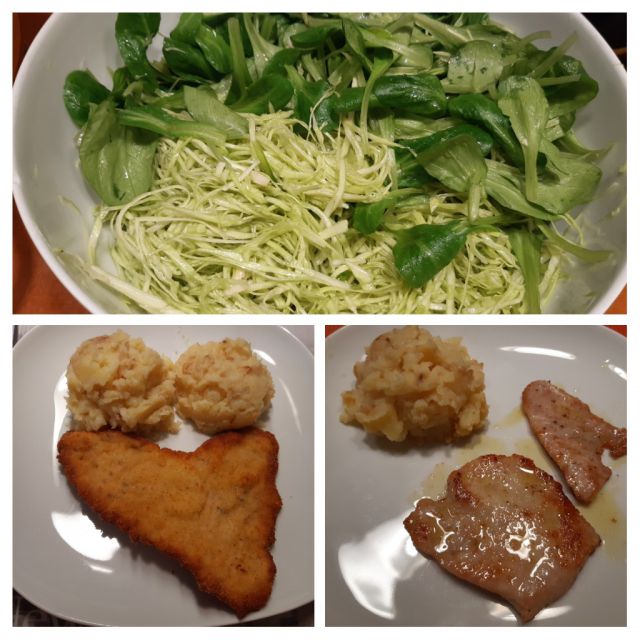Danes meso po dunajsko, zame pečeno,pražen krompir, zeljna solata in motovilec