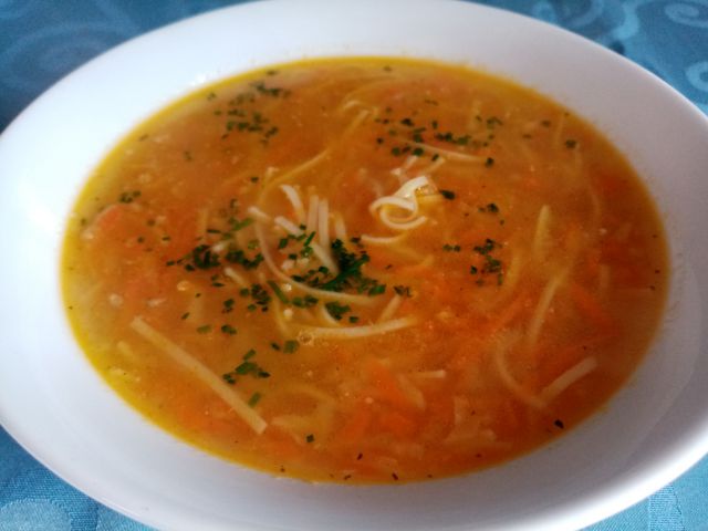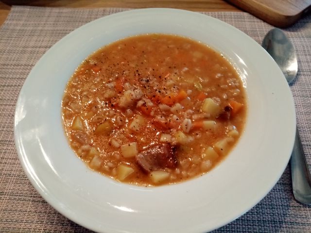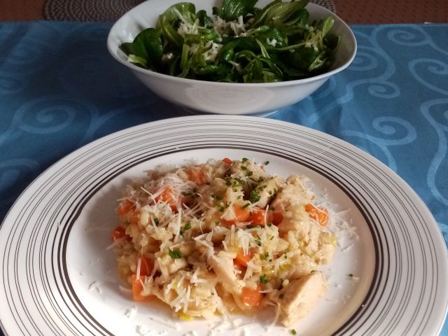 Korenčkova juhica; piščančja rižota; motovilev z naribano črno redkvico