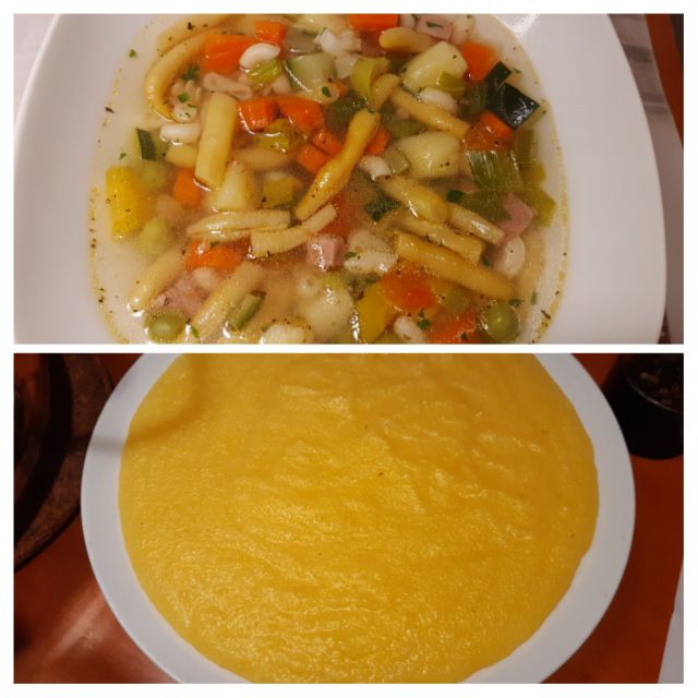Danes mesno-zelenjavna mineštra, polenta, torta od včeraj.