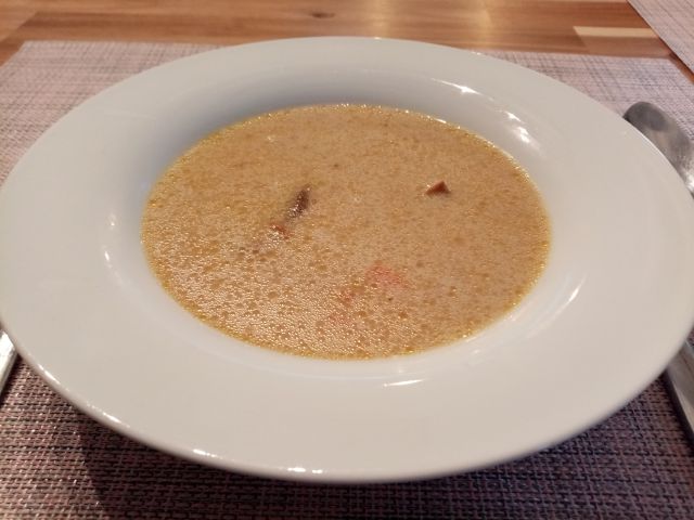 Goveja juha z mesom in rezanci, ajdova kaša z jurčki, solata, kava